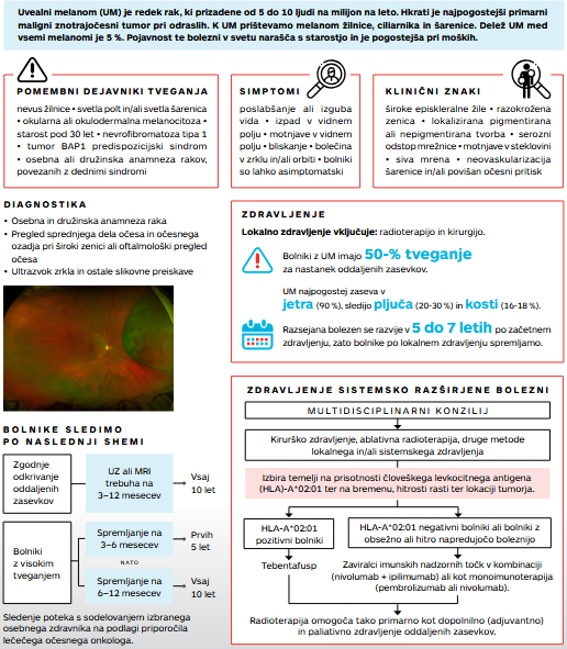 Uvealni melanom je redek rak, ki prizadene od 5 do 10 ljudi na milijon na leto. Hkrati je najpogostejši primarni maligni znotrajočesni tumor pri odraslih. K uvealnemu melanomu prištevamo melanom žilnice, ciliarnika in šarenice. Delež uvealnega melanmoma med vsemi melanomi je 5 %. Pojavnost te bolezni v svetu narašča s starostjo in je pogostejša pri moških. Kateri so pomembni dejavniki tveganja, simptomi in klinični znaki? Kako postavimo diagnozo in kako poteka lokalno in sistemsko zdravljenje razširjene bolezni? Zakaj je pomembno sledenje bolnikov po lokalnem zdravljenju?