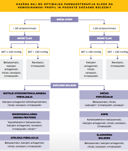 Kakšna naj bo optimalna terapija stabilne angine pektoris glede na hemodinamski profil in sočasne bolezni, kot so motnje atrioventrikularnega prevajanja, mikrovaskularna angina pektoris, atrijska fibrilacija, srčno popuščanje, kronična obstruktivna bolezen in sladkorna bolezen?